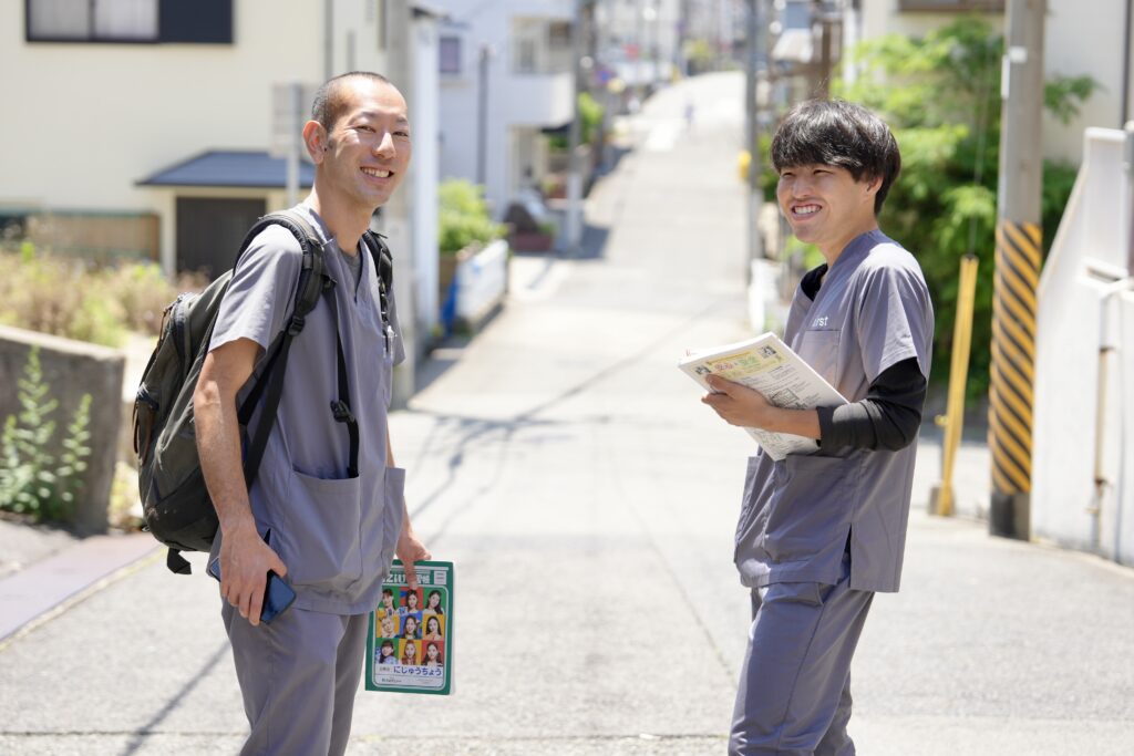 理学療法士の寺脇さんがfirstに入職を決めたのは、SNSで見た「地域への熱い想い」。実際に飛び込んだ在宅医療の現場は、想像以上に挑戦的で、想像以上に温かいものでした。